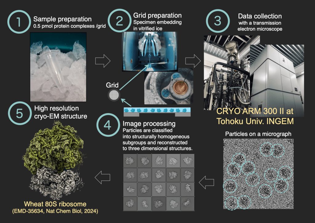 We are using the CRYO ARM 300 II (JEOL), introduced at Tohoku University, to facilitate numerous collaborative research projects. Our structural analysis work extends beyond ribosomes, aiming to achieve high-resolution structural analysis of diverse biological specimens.